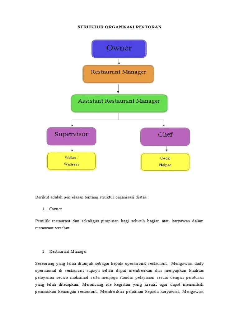 Supervisor seseorang yang diangkat dan diberi tugas . Tugas awal pemilik akan memperoleh . Bertanggung jawab dalam jalannya operational kerja restaurant jika manager sedang tidak ada di tempat. Presentation name by fyeraariana on emaze. Pemilik restoran adalah individu yang memiliki dan mengawasi operasi penubuhan. Pemilik restoran adalah individu yang memiliki dan mengawasi operasi penubuhan. Bagaimanakah carta organisasi restoran dan fungsinya budaya umum .